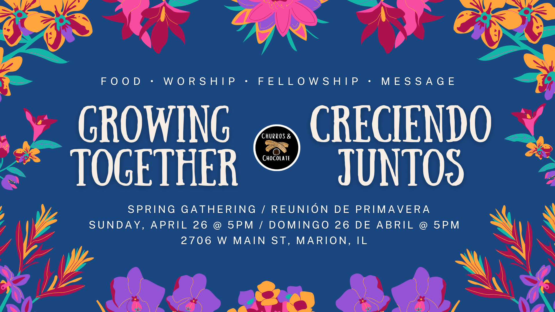 Come and enjoy a fun afternoon among friends with dinner, churros, worship, a biblical message, an ice cream bar, and delicious Mexican-style popsicles. Bring a dish to share and your family.